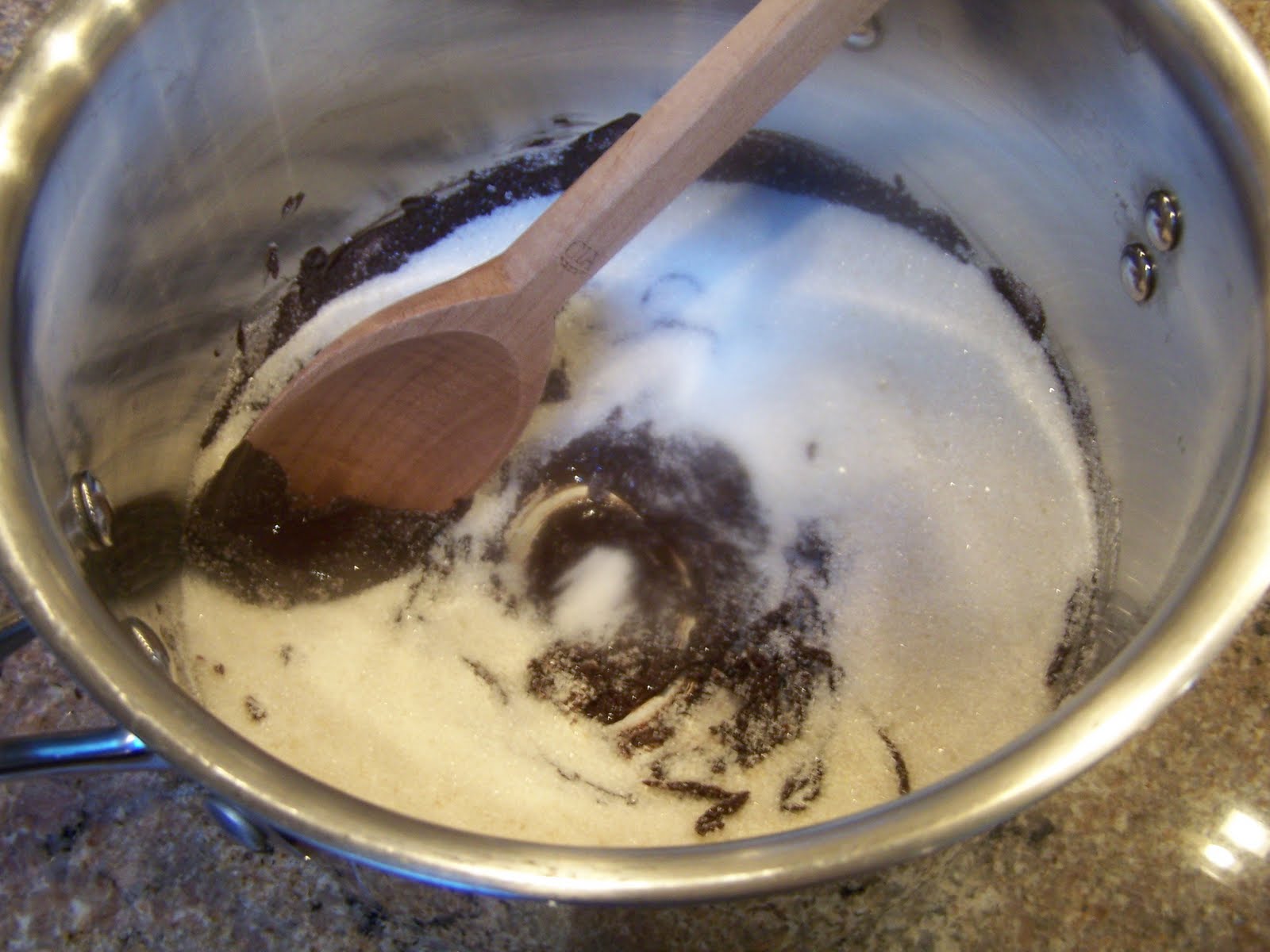 Once the chocolate melts, remove the pan from the heat and stir in the eggs, sugar, oil, baking powder, and vanilla. (You have to remove it and let it cool down a bit so it will not cook your eggs).