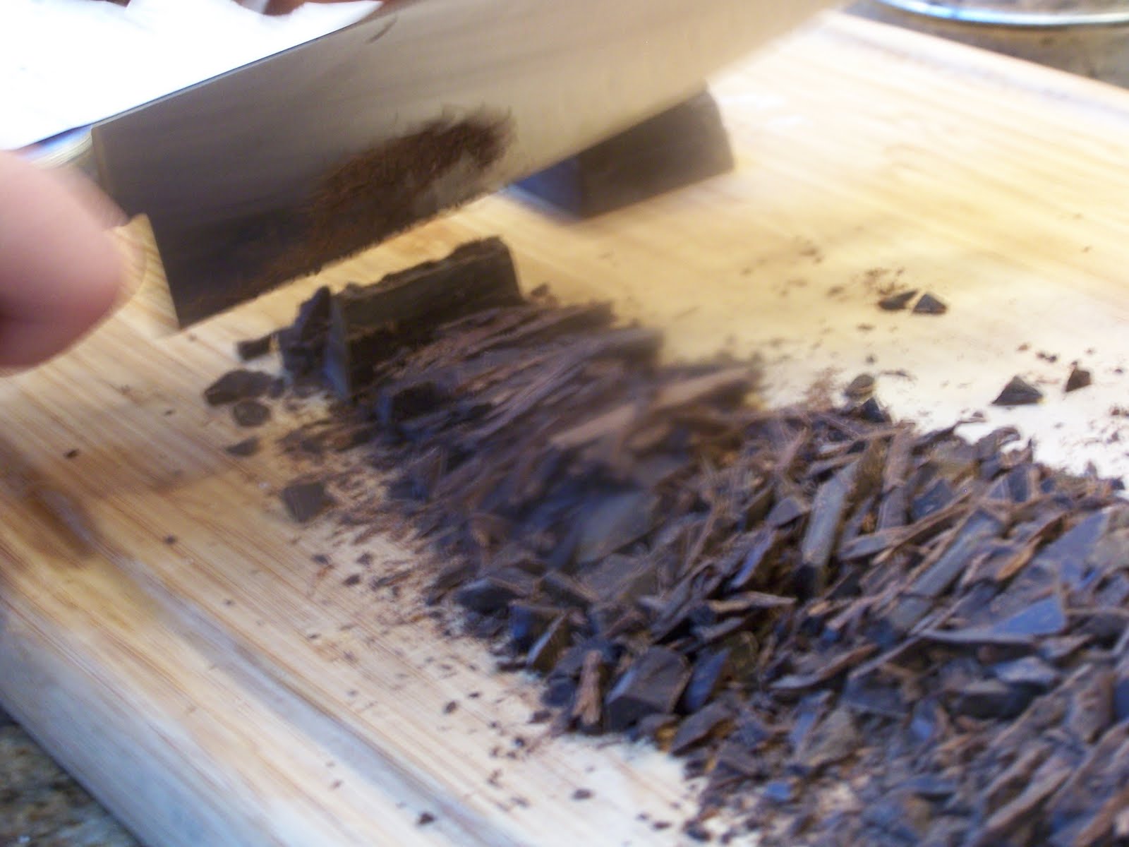 To begin, chop the chocolate thinly and evenly to help it melt quickly and easily. Lauren and I shaved the chocolate so it would melt quickly.