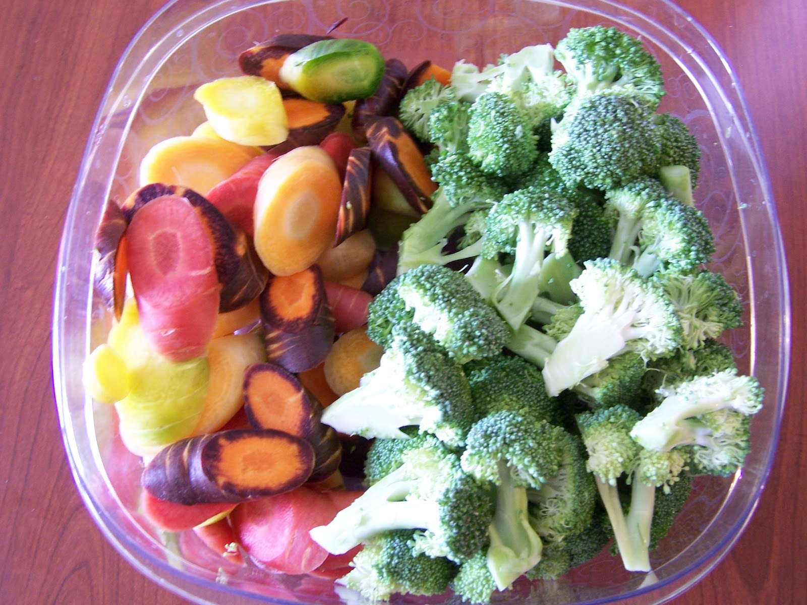 I get extremely excited any time I find multicolored carrots, and I bought them on impulse. They add some color and a punch of nutrition to my humus and veggie snack.